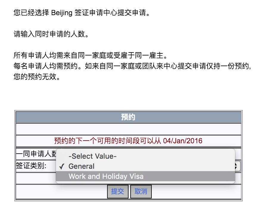 4、选择好了后,点击提交。然后选择签证的种类 work and holiday visa,一同申请人数只能填1(填别的无法继续)。选择好了以后,点击提交,如果还有名额,那么就会显示下一个可用的时间段可以从xx,如果没有名额,则显示:无日期(委任)。申请的时候请务必选择work and holiday visa!(平时练习可以用模拟预约系统)