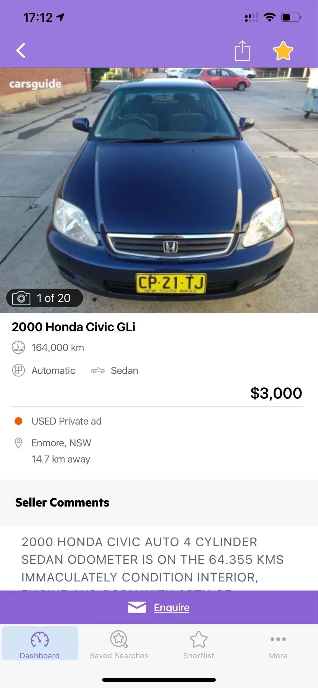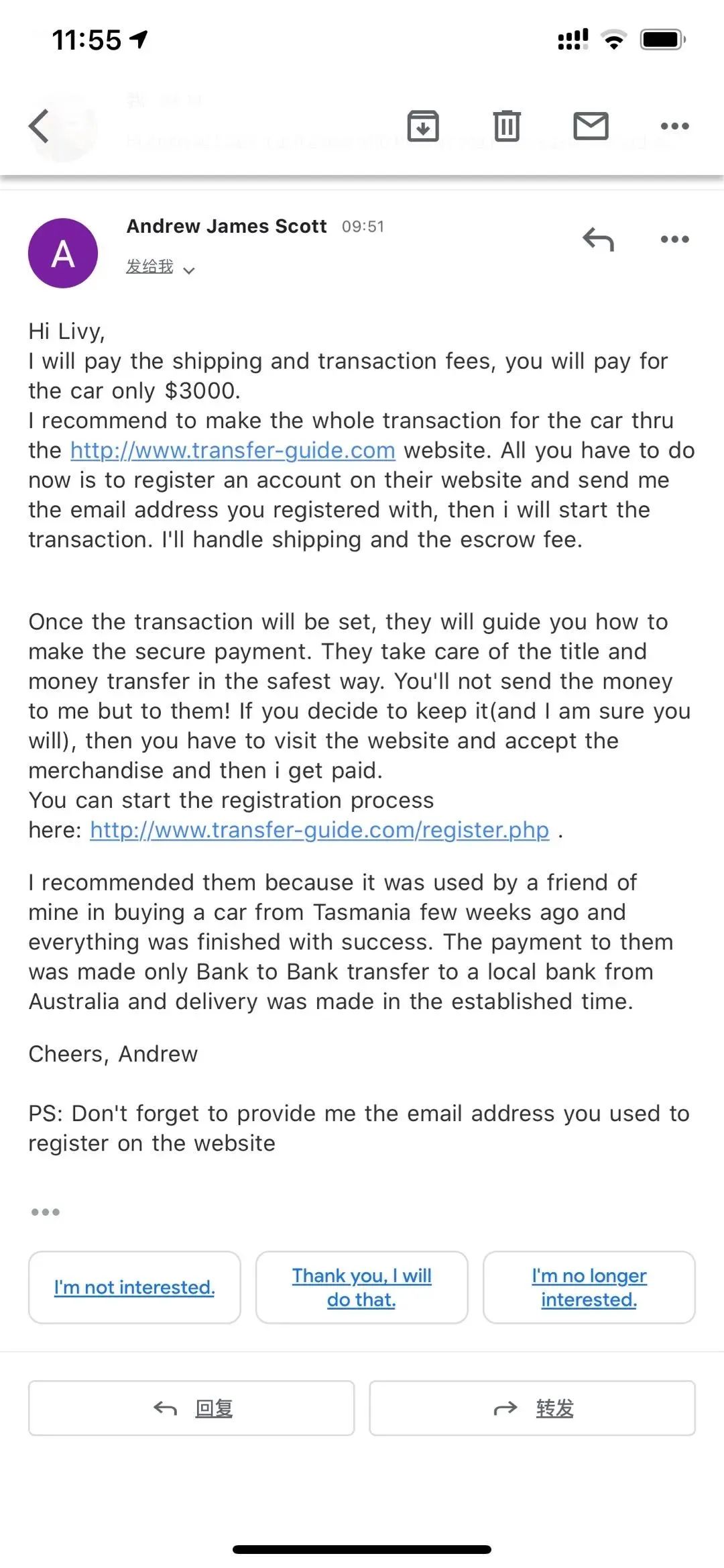 差点被骗那事大概是这样,我在Carsales App上,看到一辆参数和价格都非常吸引眼球的车,就给卖家——一个叫Andrew的男人发了邮件。 卖家很“真诚”地回了邮件,给了更多车的照片和信息。我越看越觉得不错,想约看车。 然后套路就来了。他回信说,他和车目前在西澳,因为工作原因,被国家安全部临时调去西澳,还把他的工作证——澳洲国防部某职位——发给我看。 以及一大段文字解释道,他要前往阿富汗,做沙漠培训啥的,所以才“廉价”卖车。 为显“诚意”,他说可以免费把车运送到我这里,给我十天的检查和试用期,即使如果最后我不买。还发了一个可以查车辆注册信息的网址给我。 然后他说,为“安全起见”,我们的交易可以通过一个第三方网站——什么二手车交易资金托管来着,让我在网上开个户,打钱进去,在确认我要买下这辆车之前,他是不会收到这笔钱的。 好家伙,看到这我都笑了,小说都不会写这么蠢的情节。 因为闲,我去他提供的网址看了看,胡编下个人信息注册了,提示打钱的时候,我关掉了网页,回了邮件给他,骂了一通,跟他说我要报警,以免他再害别人。 不过我不了解在澳洲如何报警,也就是吓唬他一下。这么拙劣的手法,骗子真是蠢到家了。 后来又约了几次看车,都被放了鸽子。没想到这里卖车是这样的:即使我跟卖家约了周六,但如果周五有人去看,并且买下了,我就没办法再去看车。 说回老马。在澳洲本地二手车网站连续碰壁之后,我转战Facebook刷集市,看到我现在这辆车的卖车信息。 现车主Sunny是个台湾男生,要回台了所以卖车。我看到价格什么的都比较合理,鉴于之前的经验,我跟他约了第二天试车。