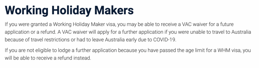 申请费退还:因旅行禁令无法前往澳洲,或者因新冠疫情提前离开澳洲的打工度假签证持有者,且如果因超龄无法申请新的打工度假签证,则可以申请申请费退还。