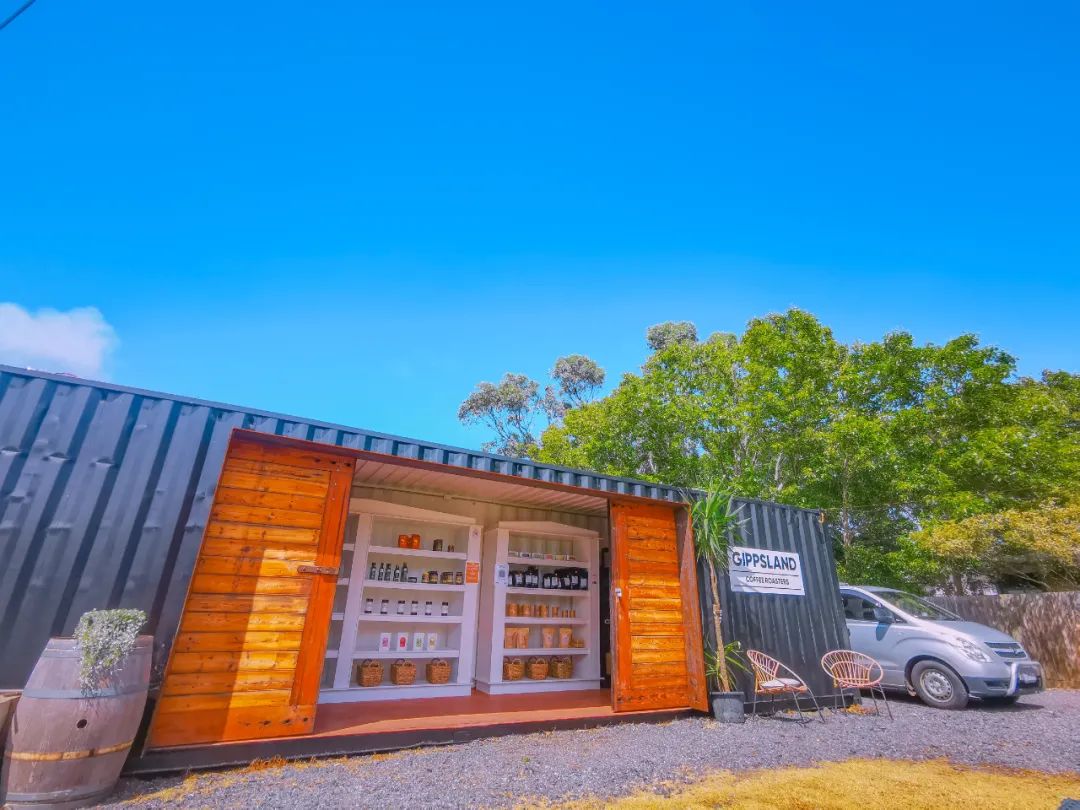 这是一家位于马路边上的咖啡馆,而且是游客开车通过跨海大桥进入菲利普岛后,望眼所及的第一家咖啡馆,地理位置极其优越。但与其说是咖啡馆,还不如说是咖啡站,因为它与我们想象中的咖啡馆完全不一样,没有暖黄的灯光,没有舒适的躺椅,没有文艺的格调,而是由两个黑色的集装箱组成的,一个集装箱制作咖啡饮品和出售热食,另一个则是用来烘培和零售咖啡豆,此外,户外宽阔的大草坪上再摆几张木制的餐桌与高脚凳,这就组成了一个特色又新颖的咖啡站了。