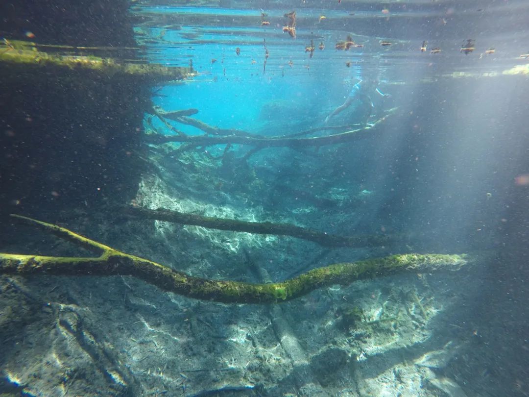 水下沉睡的树干布满了青苔,尽管悬浮着奇奇怪怪的杂质,但池水可以用透明来形容。就是跟仙本那和大堡礁的海水比起,也毫不逊色。眼前只有一束束阳光在闪动,以及池底的沙面光波在荡漾。一口气接一口的,一个猛子扎入水中,就是区别于水面之上热带雨林的另一个世界。