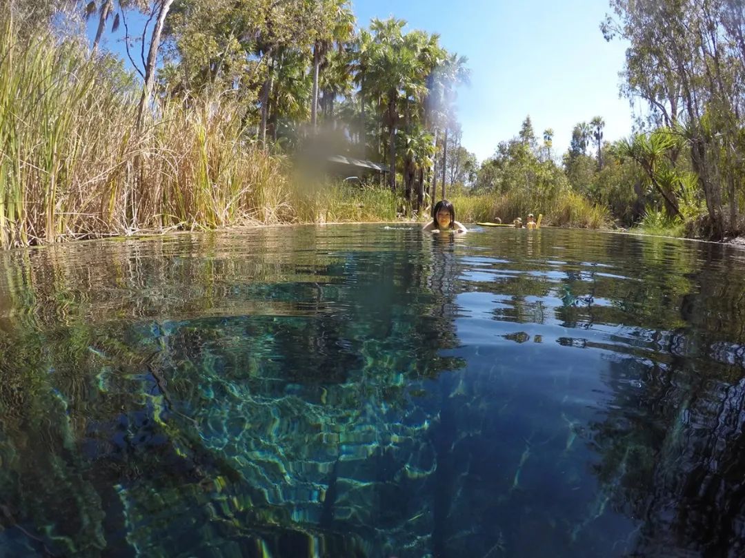 如果去Rainbow Springs可以住在一旁的Mataranka Homestead,营地旁就是温泉步道的入口,全程仅需不到五分钟。温泉被石头堆砌修缮完成,像水晶一般清澈,池水遭受热带雨林的屏蔽,阳光从庞大的棕榈树叶缝中穿过,洒在水面再直射到池底,不用滤镜也颇具ins网红风,可以非常舒适地坐在池边不锈钢平台上聊着天,游泳的话,就显得有些拥挤了。