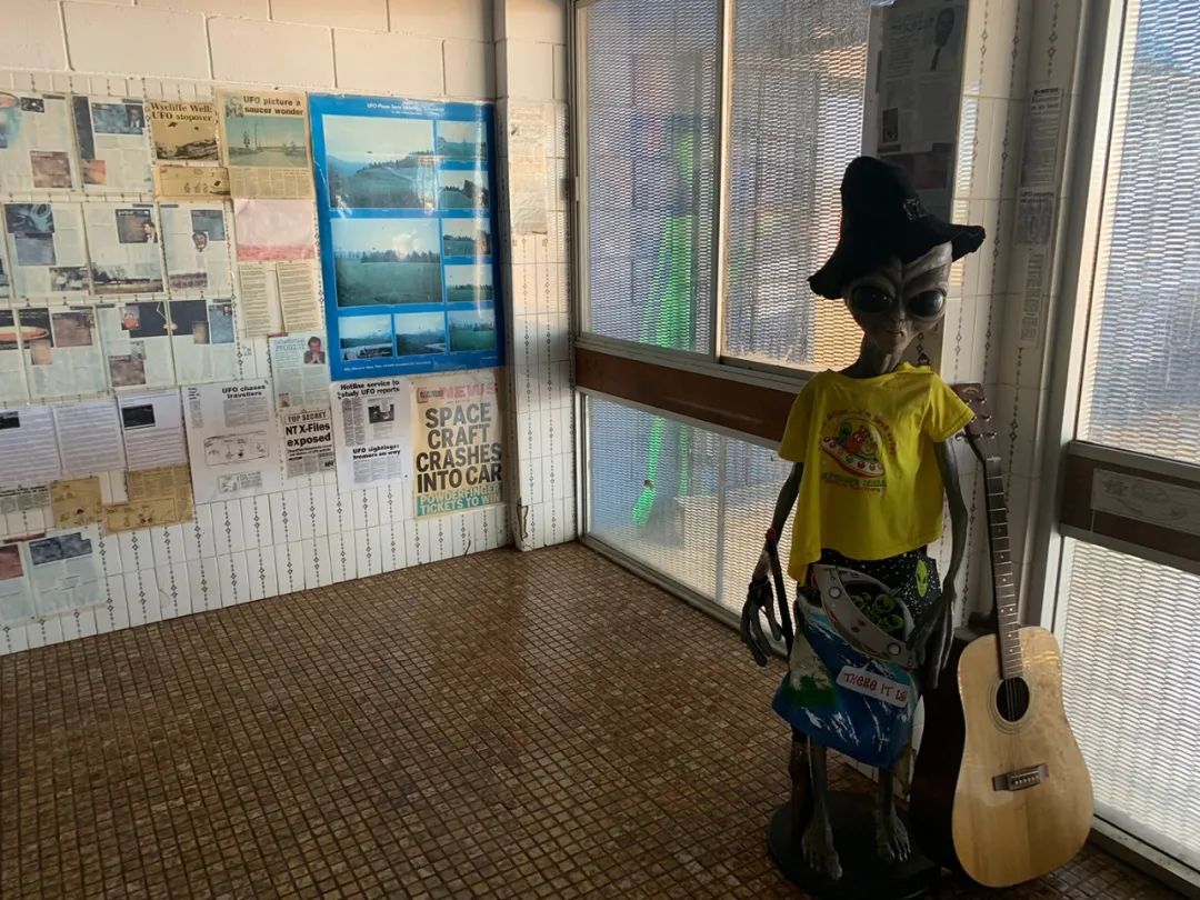 驱车继续向北两个小时,会有一个加油站外的飞船着陆舱牢牢吸引眼球,Wycliffe Well Roadhouse据说是澳洲外星人活动的高发区域,出现UFO的频率极高。以至于被称为外星人小镇,里里外外装饰有各种各样的外星人和飞碟的模型、壁画,小屋内售卖着奇奇怪怪的外星人周边,墙上的假报纸中告诉过往的游客,这里就是澳洲UFO的发源地,有着不少外星人来访的新闻报道。