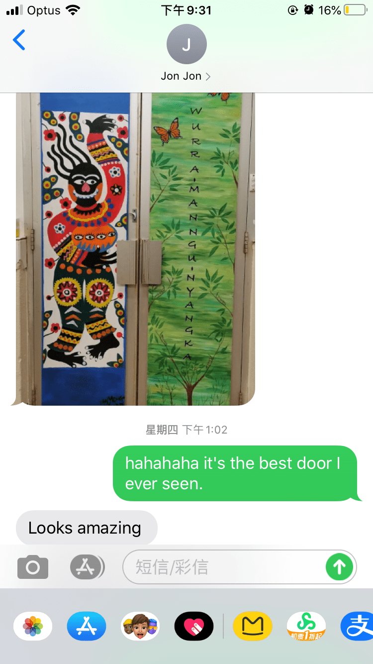 进门时,我发现 youth centre的门的尺寸和木板还挺一致的,就是这随口一说。如今,它真的挂在了门口,成了名副其实的门神。还挺好的,全村的孩子来这里都会先看到我的画。