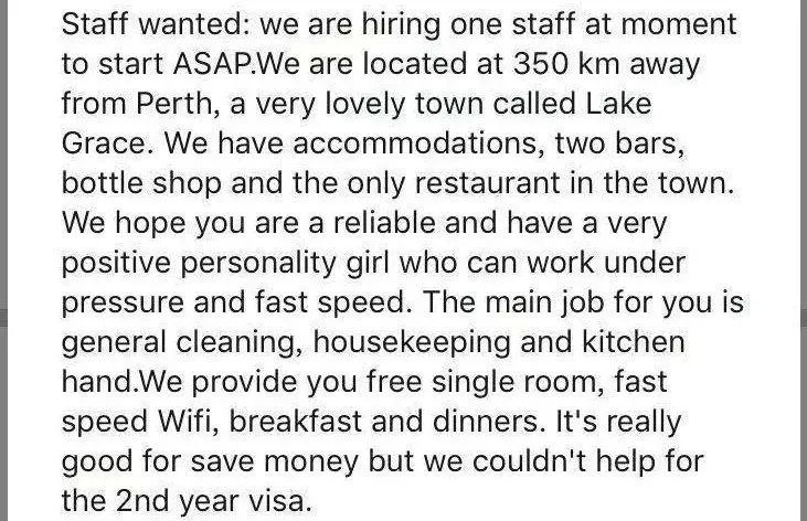 来之前电话和微信都再三确认了职位和薪水,是Housekeeping+Kitchen hand,每周700刀包吃包住,工时大概38小时,结果来的第一天就全部推翻,让我做Bartender,还说我没经验要砍掉200刀,6天上了47小时,还要我周日继续加班!没有任何信用可言!最终答应给700刀,辞职走人。
