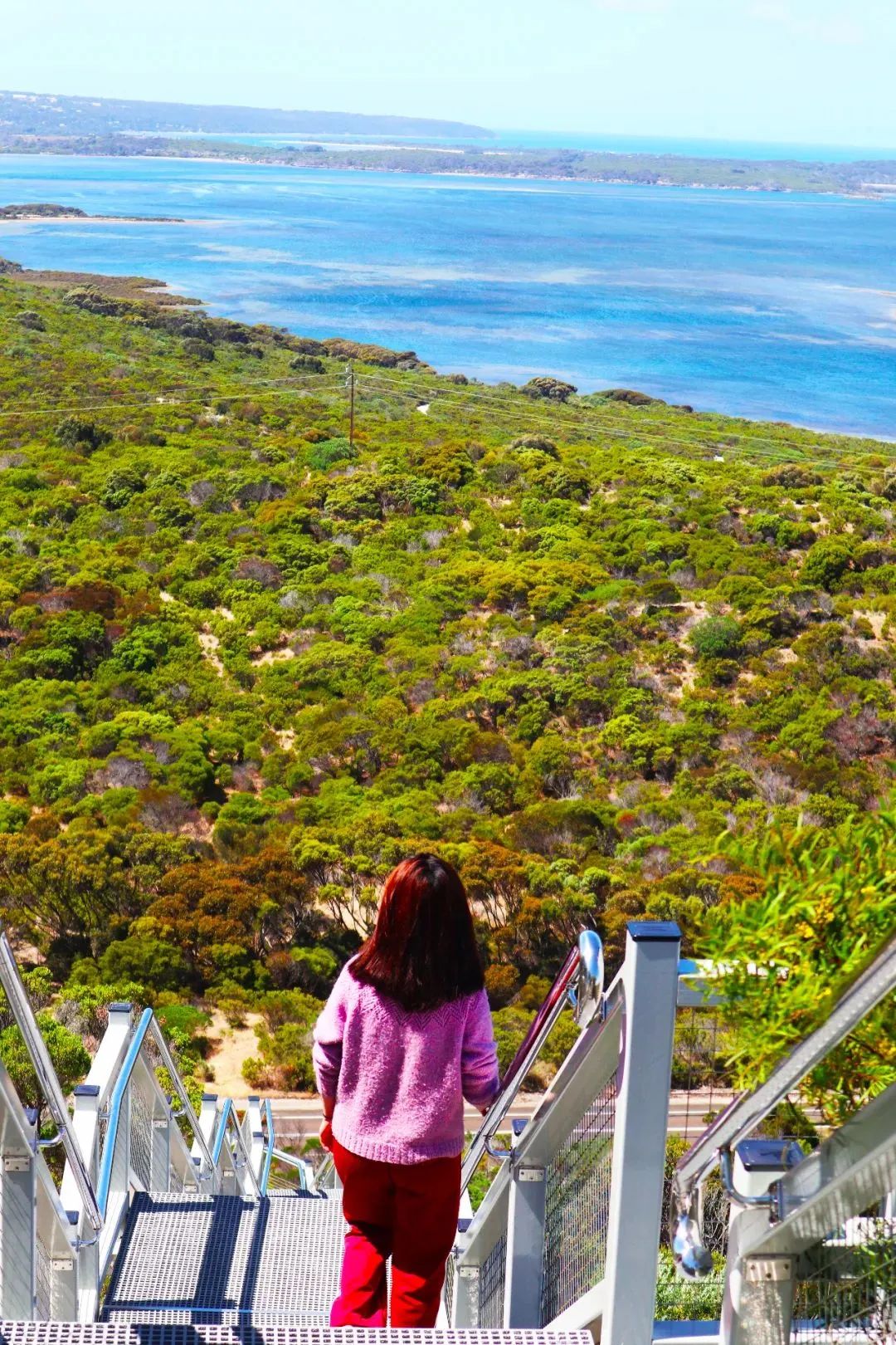 Prospect Hill:号称袋鼠岛海拔最高的山,爬完全程只要十分钟,因为是新修建的登山楼梯,所以爬起来很轻松。爬到山顶的风景还是很美的,这里有个很大的停车场,适合飞无人机。可以作为上岛后的第一站,用不了多长时间就可以游览完,就位于下船的港往袋鼠岛里面去的路上,顺路停一下就可以。
