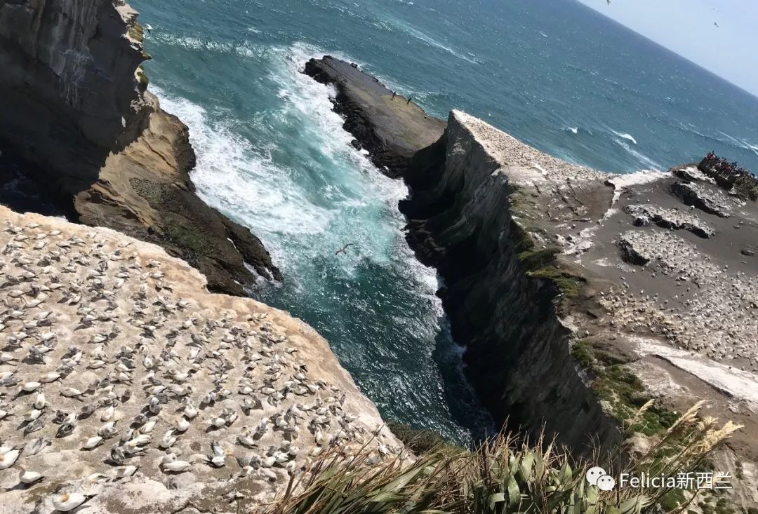 那天早上,我们来到Muriwai beach ,俗称鸟岛。这里是奥克兰的两个黑沙滩之一,上次上次去过的皮哈沙滩也是一个黑沙滩。从山上远远望去,就看到了有点陡的小悬崖,小悬崖下面就是大海了。