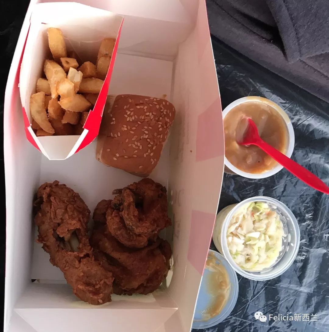 然后要回去的时候突然想知道这边的肯德基跟国内有什么区别,于是我们开着车通过drive thru 买肯德基了,点餐的时候直接在一个机器上跟店员说要买什么就好了,然后一路开到窗口,拿餐付款就ok了。我发现这边的肯德基确实有很大不同。它的套餐里面竟然还有超市买的巧克力棒,还有沙拉,最重要的是炸鸡和薯条味道还是有些区别的,然后还配有土豆泥加gravy(肉汁),一边吃着薯条一边在想,为什么没有番茄酱?国内都是配带的,但是这边没有,我问一个毛利同事,她说有些人不要,你要的时候要跟店员说她就给你了。