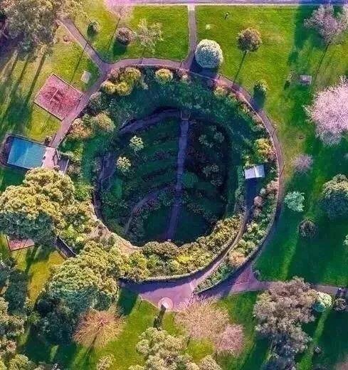 都说上山下海,但是在Mount Gambier却是相反的。你要的一泓洗涤心灵的蓝湖在海平面之上,然而隐秘的花丛园林却在洞底。洞穴花园离蓝湖也是很近,不到十分钟的车程就到了。