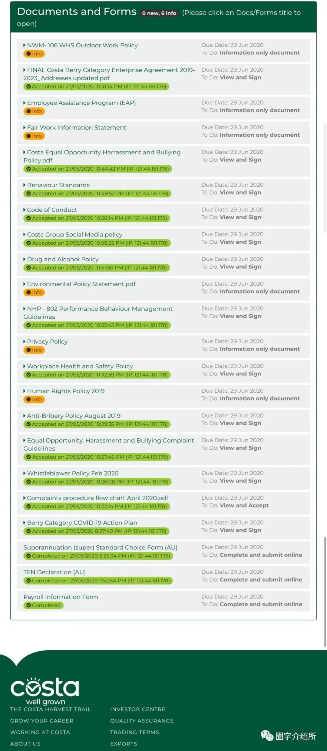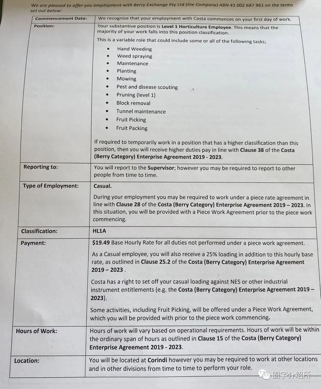 在还没来澳洲之前,就听说了Costa农场。在一篇推送上看到一个“澳洲五星级农场”的头衔,所以充满了好奇,而且最重要的,它可以集二/三签。 所以三月份就在官网提交了第一次工作申请,但当时还没有买车,所以在官网填的超长申请表也就这样石沉大海ing… 申请步骤: 在官网右上角,点“Work with us”。 在“Vacancies”一栏里会显示现在空缺在招人的岗位,建议可以在Location一栏中按自己的当前位置或想要迁移的位置进行选择,如果等Costa回复你然后再移动到很远的地方,可能时间上会来不及。 以我体验的西澳为例👇 有卡车司机和摘莓的岗位,但是对于大多数人来说,没有卡车证,就只有摘莓的选项。 按自己的信息真实填写申请表,如果有朋友已经在Costa工作记得写上他们的名字。一定要信息完整,提交有错误或遗落的话不能修改,只能取消申请后,再次填写提交。表格内容非常多,所以一定要认真确保无误哦。 我买完车想去补充车辆信息,就体验了一次推翻重来的过程。 如果有车的申请者需要提供“drivers licence”和“car registration document”的pdf,我是把中国驾照用手机app扫描成照片+驾照翻译件+REGO付钱账单扫描一起提交的, 5月5日官网再次提交申请 5月9日发送简历和cover letter到邮箱📮 waberry.recruitment@costagroup.com.au 5月13日收到邮件,说明他们只接受网上在线申请,只会一小部分人会进入induction,请继续耐心等待。 5月17日依然没有进展我又发了简历到Employment_Costa@australiamail.com 5月26日收到了关于新冠疫情的补充调查邮件,就是问你啥时候到的西澳,近期有没有离开过澳洲之类的问题。 填写完就会自动回复邮件,说着感谢我们会很快联系你之类的套话。 居然!晚上我收到了来自邮箱📮waberry.recruitment@costagroup.com.au的回信,看了我的简历和求职信让我记得去官网提交申请。 我跟她说我已经交完表格了,然后问她有没有关于下一步还可以继续做一些什么的建议。在等待她回复的同时,我发挥打不死的小强精神继续在网上挖渠道。给邮箱📮Spencer.Clark@costagroup.com.au也发送了一份简历和求职信,因为在别的公众号看到说是经理的联系方式,但是没有回信,并且我们进去之后的manager是Ryan Cantello。 5月27日,竟然收到邮件让我去完成就业包表格。 登陆官网之后,我的主页里果然就多了一项“Employment Pack”。 就业包里还特别提醒你在填写完表格之后不要去联系他们,等他们有工作了会发邮件通知你。 在表格填写中有任何问题可以联系招募团队,西澳的联系方式也就是看完我简历邮件之后的回复我的邮箱,所以个人认为,申请西澳GinGin农场,除了官网申请加投邮箱📮waberry.recruitment@costagroup.com.au 中的机会比较大。其他州也可以同样试试投相应的联系方式。 就业包里等待你的是更多的表格,有一些类似TFN/Super之类的是需要在线填写的,其他更多的是需要你在线阅读完成之后它就会变成绿色已完成。表格后面的“To Do”会写清楚需要你是需要阅读签字还是需要填写信息。 5月28日收到来自Charlie Michael的邮件通知我第二天去induction。 邮件是群发的,收件人除了我之后还有另外五个人。 王人青没有被通知去induction是因为在我发现收到就业包的时候,她去检查申请表才发现在她补充车辆信息的时候没有提交… 但是,第二天去induction的时候,我们心存侥幸的想要试一试看能不能成功。 大门是虚掩着的,打开门开车进去之后就碰到辆车指引我们往一个方向开,车上的人也就是我们的manager——Ryan Cantello。停好车之后被要求先呆在车里不能下车,需要测完体温合格之后才可以开车上坡去到办公室参加induction。 Ryan拿着表格一个个对人名,一听到王人青不在名单上,就表示她只能呆在车里不能参加induction,但同样被要求测体温。 农场里限速,有一个路段限速为10,等终于开车到办公室附近后,我们依然被要求呆在车里,暂时不能下车。 我不知道Ryan是不是收到过我的邮件,他一见面就叫出我的名字,还问我王人青是不是我邮件里提到跟我一起申请的Miko,我们跟Ryan解释了她由于大意所以导致第二次的没有提交成功,但是她已经完成了网上申请,并且还给邮箱📮 waberry.recruitment@costagroup.com.au 发送过了简历和求职信,于是他询问是否可以给他看邮件内容并且帮助我们一直打电话和他的同事沟通。 在沟通过程中,他让我先进办公室induction,在我填写完表格之后,王人青也被允许进来参加了~ 🉑️喜🉑️贺,终于两个人成功induction了。 同时参加induction的是三个🇫🇷法国人,两男一女是朋友;一个🇨🇳台湾女生和一个🇰🇷韩国男生,是情侣。情侣俩是同时申请的,但是只有女生收到了induction通知,男生完成了就业包之后却没有了下文。 但最终,韩国男生也成功参加induction,和王人青两个人被Ryan要求提供护照进行拍照发给同事进行核验信息。 Induction的内容主要针对疫情期间的防护,勤洗手,保持社交距离,路上小心开车,早出门安全驾驶,不要撞袋鼠,农场蚊虫动物处理之类的安全知识培训;签署关于工资的文件。 签字的时候问了他们说可以拍照,回家就把照片拿给熊叔看,熊叔看完马上说这个工作不好,没有时薪,只按计件算,对于你们这种新手很不利,所以你会很长一段时间拿很低的工资。我还解释说,它每天的价格都不一样,应该会尽量保证不低于最低时薪吧,事实证明,熊叔是对的哈哈哈。 Costa 农场是否工作以及集